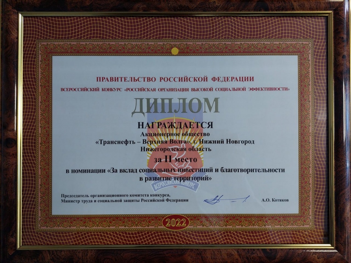 Одним из призеров федерального этапа всероссийского конкурса «Российская организация высокой социальной эффективности» — 2022 стало АО «Транснефть-Верхняя Волга».