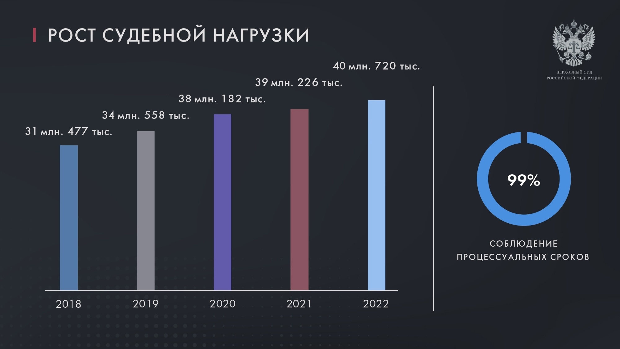 Итоги работы судов подвел Председатель Верховного Суда Российской Федерации Вячеслав Лебедев. В аналитической части доклада он отметил, что только по первой инстанции судами в ушедшем году рассмотрено более 40 млн. дел – на 1 млн. 494 тыс. больше, чем в 2021 году. В порядке гражданского судопроизводства рассмотрено 25 млн. 694 тыс. дел – на 2 млн. 310 тыс. дел больше, чем в 2021 году.