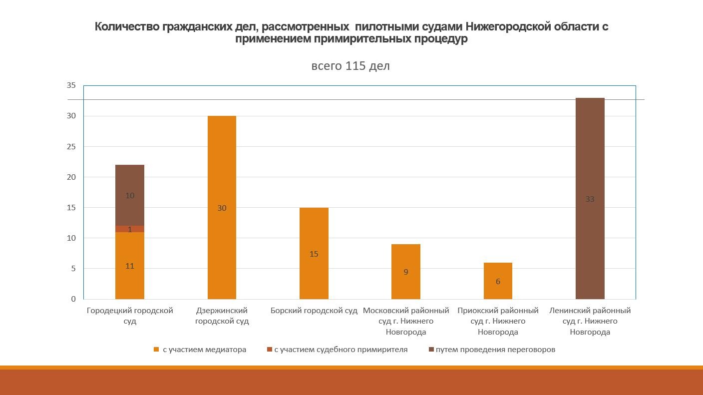 Необходимость популяризации судебной медиации была обозначена еще в мае 2022 года в рамках регионального круглого стола «Судебная медиация в России: опыт, проблемы, перспективы». Впоследствии определена группа пилотных судов для активизации апробации применения примирительных процедур и формирования методического опыта с целью последующего его распространения среди судов общей юрисдикции Нижегородской области.