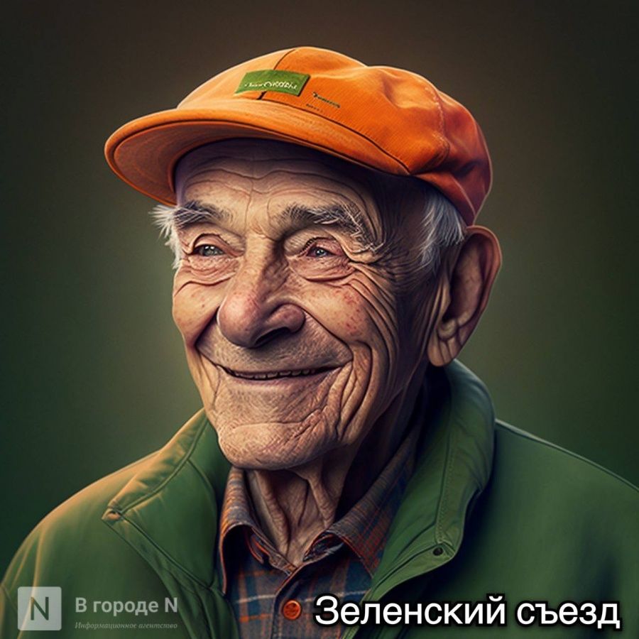 Зеленский съезд изображен в облике добродушного старика в оранжево-зеленой одежде, что напоминает о травянистых склонах и кирпичных стенах Кремля поверх них. А рыжеволосая девушка, изображающая Кремлевский бульвар, символизирует знаменитые нижегородские закаты.