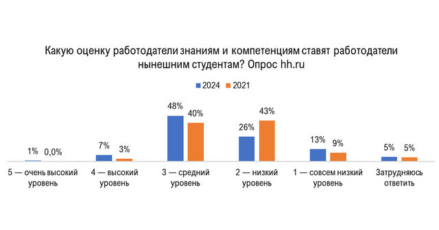 Опрос hh.ru свидетельствует, что работодатели в большинстве всё ещё склонны ставить «тройки» знаниям и профессиональной подготовки недавних выпускников. Причем за три года доля тех, кто ставил 3 из 5 баллов выросла на лишь 8%. Из хороших новостей: на 17% упала доля среди работодателей, недовольных подготовкой молодых специалистов и ставивших «двойку» знаниям недавних студентов. Теперь таких лишь 26% компаний, в отличие от 2021 года (было 43%). При этом на 4% выросла доля компаний, которые довольны подготовкой молодых кандидатов, правда количество таких работодателей очень мало – лишь 7%, прошедших опрос.