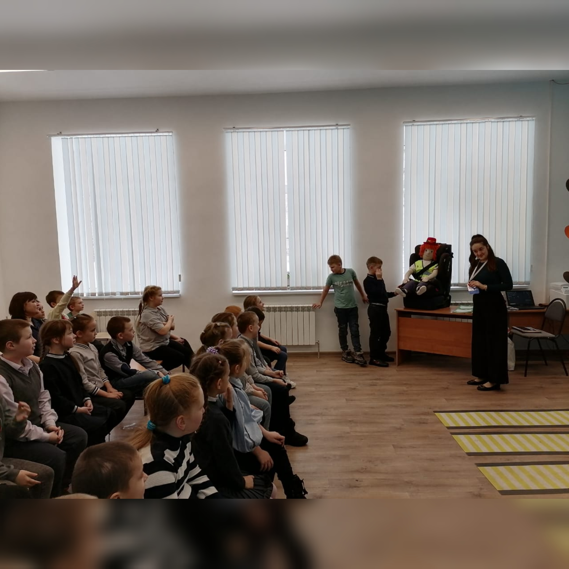 Дети с большой радостью выполняли различные практические занятия: учились правильно пользоваться ремнями безопасности, оказывать первую помощь пострадавшим.