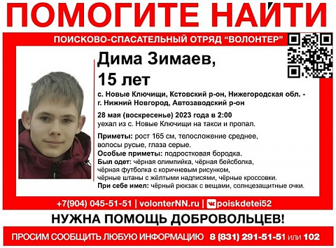 Согласно информации, 28 мая 2023 года в два часа ночи 15-летний Дима Зимаев уехал на такси из села Новые Ключищи Кстовского района. С тех пор о его местонахождении ничего не известно. К поискам мальчика подключились волонтеры.