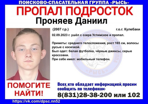 16-летний Даниил Проняев пропал в городском округе Кулебаки 2 сентября.