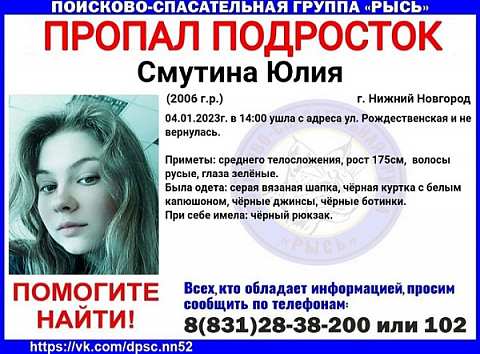 Рост подростка составляет около 175 см, волосы русые, глаза зеленые. В день исчезновения она была одета в черную куртку с капюшоном белого цвета, серую шапку, черные джинсы и ботинки в тон. С собой у Юли был черный рюкзак.
