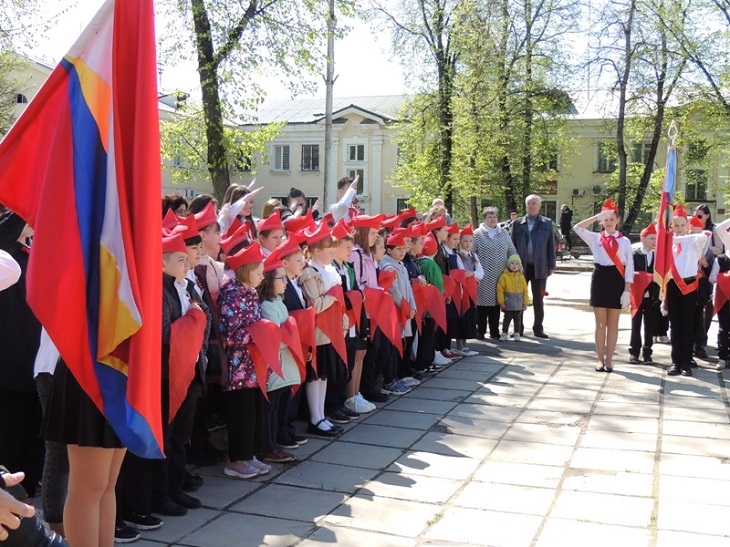 У стелы в честь 40-летия Победы на проспекте Мира состоялась торжественная линейка, посвященная 78-й годовщине Великой Победы и приему в пионеры третьеклассников из школ №№ 7, 10, 11.