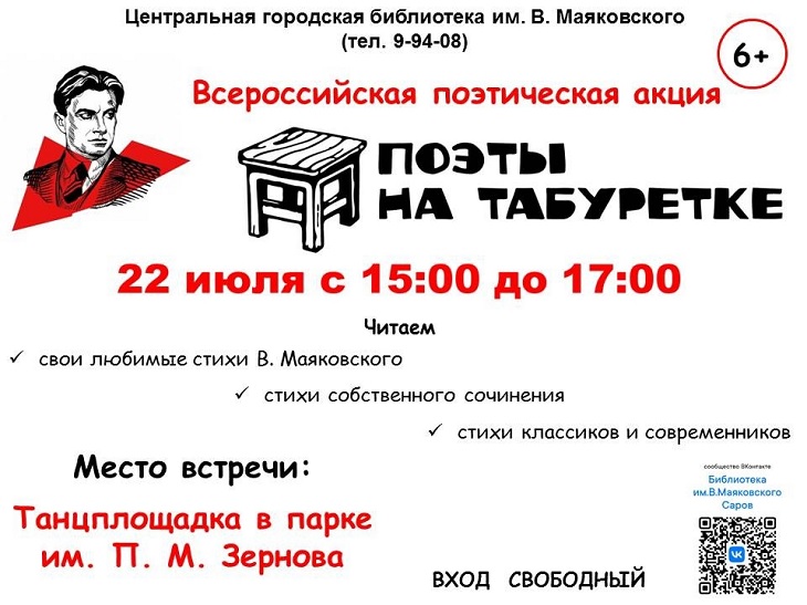 22 июля в 15:00 в парке имени Зернова, на танцевальной площадке пройдет Всероссийская поэтическая акция #поэтынатабуретке, приуроченная ко дню рождения поэта Владимира Маяковского.