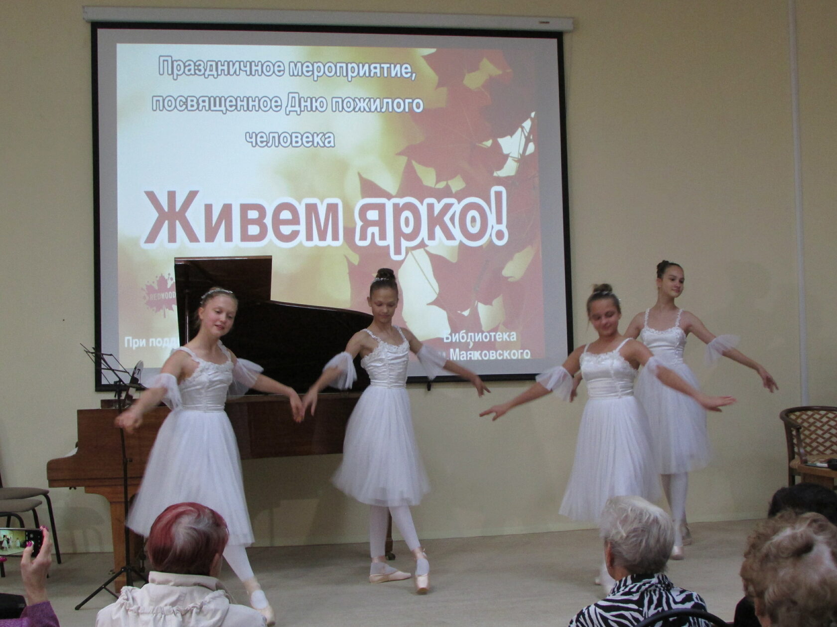 28 сентября при поддержке депутатов городской думы Ивана Ситникова и Нонны Левиной в библиотеке Маяковского состоялся праздничный концерт «Живи ярко», посвященный Дню пожилых людей. В зале негде было яблоку упасть. Здесь собрались люди с разными судьбами, характерами, разными жизненными обстоятельствами. Много теплых слов и пожеланий прозвучало в адрес милых, энергичных, мудрых участников этой встречи от наших депутатов и участников праздничного действия. Музыкально-поэтическое поздравление подготовили юные таланты из вокальной студии «Радуга (ЦВР) и Академии детского мюзикла «БиС», была исполнена хореографическая миниатюра «Подснежник».