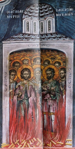 Тве́рди душе́ю по ве́ре, святи́и,/ огне́м страда́ние прие́мше, две тьме страда́лец/ вопию́ще Ро́ждшемуся от Де́вы:/ приими́ всесожже́ния на́ша за Тя,/ я́коже да́ры пе́рсских царе́й, зла́то, и сми́рну, и лива́н,// Преве́чный Бо́же.