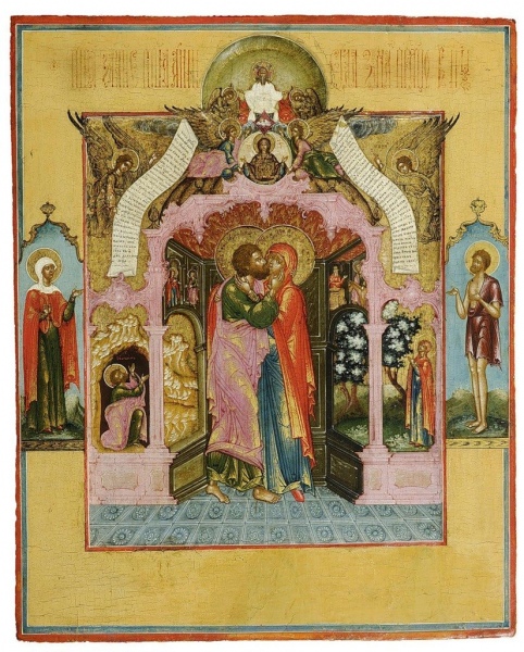 С тем же благовестием явился Ангел и святому Иоакиму в пустыне и повелел ему идти в Иерусалим. В Иерусалиме святая праведная Анна зачала Благословенное Чадо и родила Пресвятую Деву Марию.