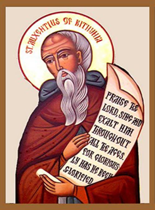 Преподобный Авксентий, по происхождению сириец, служил при дворе императора Феодосия Младшего (418–450). Он был известен как добродетельный, ученый и мудрый человек, и имел дружбу со многими благочестивыми мужами своего времени. Тяготясь мирской суетой, святой Авксентий принял сан пресвитера, а потом и иноческий постриг. После этого, удалившись в Вифинию, он нашел уединенное место на горе Оксия, недалеко от Халкидона, и стал там вести жизнь отшельническую. (Гора эта впоследствии названа была Авксентьевой.)