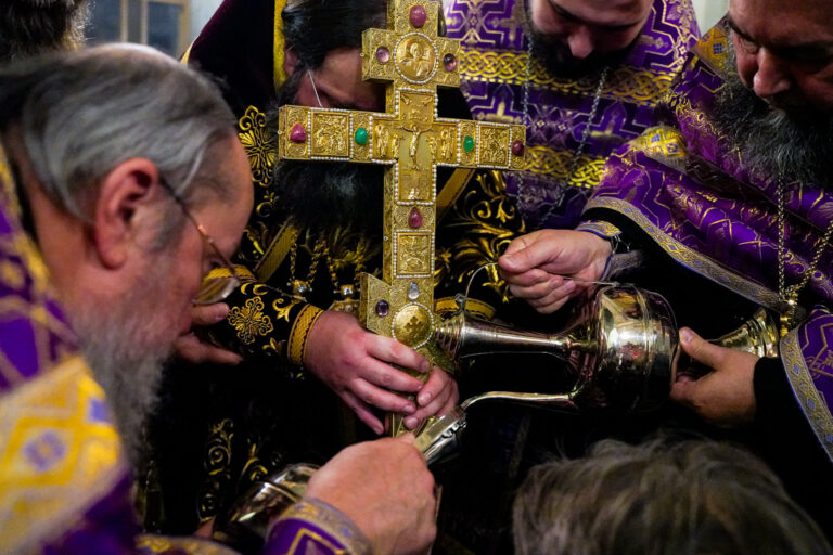 Епископ, взяв Крест и стоя на восток (к алтарю), начинает первое воздвижение — поднятие Креста вверх. Перед Крестом на некотором расстоянии становится диакон, держа в левой руке свечу, а в правой кадило, и возглашает: «Помилуй нас, Боже». Певцы поют сто раз: «Господи, помилуй».