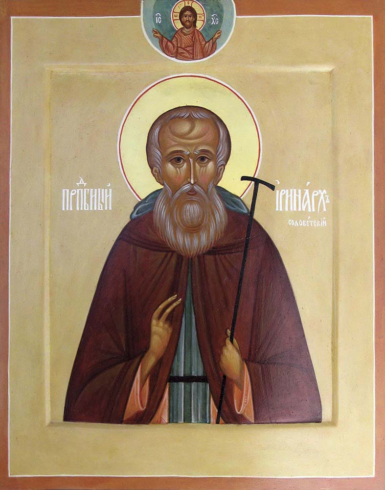 Преподобный Иринарх Соловецкий принял постриг в Соловецком монастыре и в своей иноческой жизни ревностно подражал преподобным Зосиме (память 17 апреля) и Савватию (память 27 сентября). В 1614 году, после смерти игумена Антония, Иринарх стал его преемником. В то время Соловецкий монастырь имел большое значение в защите северной России от шведов и датчан. Новый игумен много сделал для укрепления обители. При преподобном Иринархе была сооружена каменная стена с башнями, выкопаны глубокие рвы, выложенные камнями. Заботясь о внешней безопасности обители, преподобный много внимания уделял и внутреннему, духовному ее укреплению. Сам смиренный и кроткий, постоянно погруженный в Богомыслие, он ревновал о поддержании в иноках истинно монашеского духа. Под духовным руководством преподобного Иринарха в Соловецком монастыре выросли многие достойные подвижники. По благословению игумена и при его покровительстве преподобный Елеазар (память 13 января), друг и сподвижник преподобного Иринарха, основал скит на Анзерском острове.