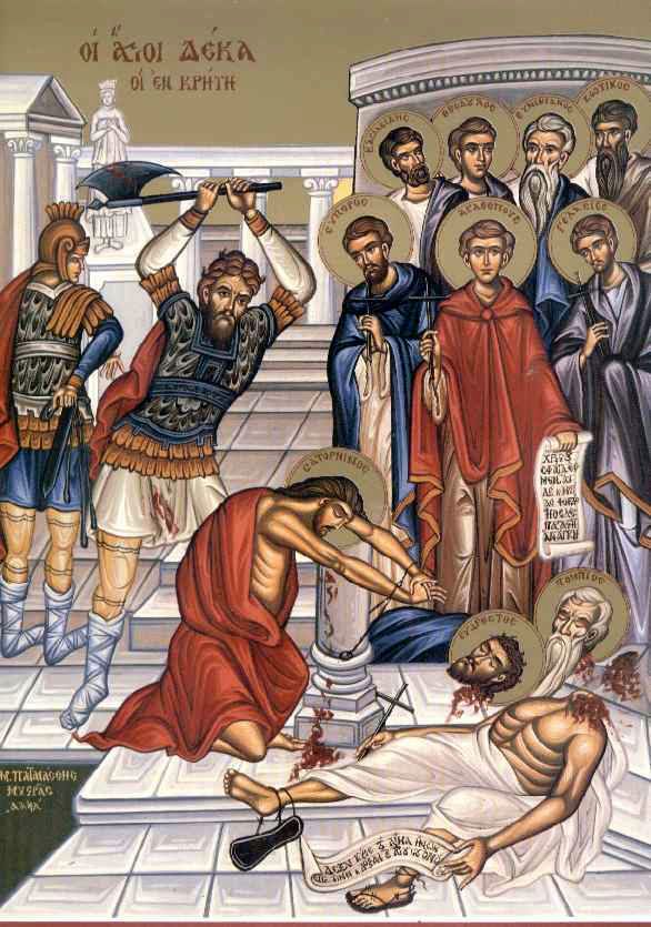 Правитель Крита, соименный императору Декию, жестоко преследовал Критскую Церковь. Однажды перед ним предстали 10 христиан из разных городов Крита, которые твердо исповедали на суде свою веру во Христа и обличили поклонение идолам. В течение 30 дней их подвергали жестоким истязаниям, но с помощью Божией они всё перенесли, славя Господа, помня слова: «Мужайтесь, и да укрепляется сердце ваше, все надеющиеся на Господа!» (Пс. 30, 25). Перед смертью они молились, чтобы Господь просветил их мучителей светом истинной веры. Все святые были обезглавлены.