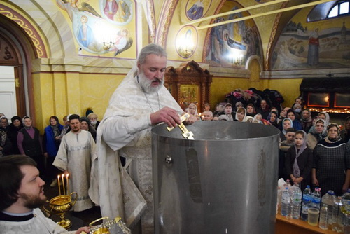 И вот в память об этом Евангельском событии мы сегодня совершили чин Великого освящения воды, и эту воду мы будем с благоговением хранить, принимать понемногу натощак и мазать больные места.”