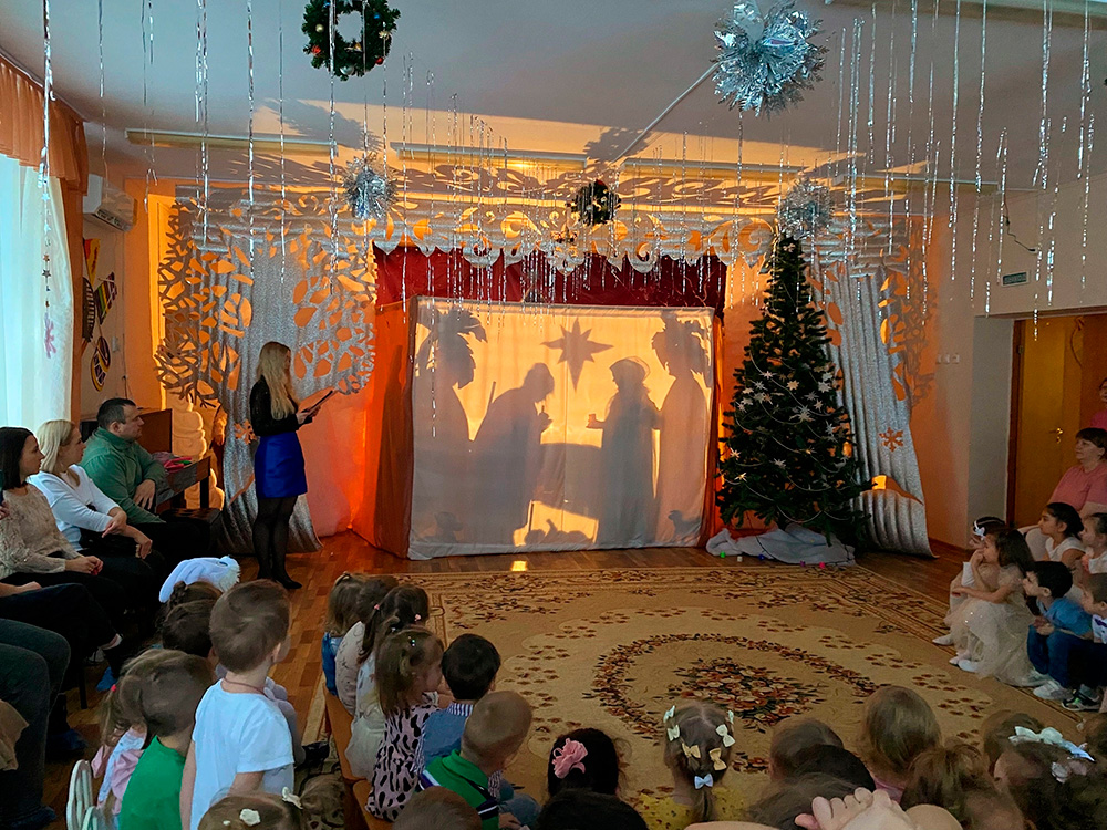 Ребята посмотрели Рождественский спектакль теней, приготовленный педагогами этого учреждения, спели песни и почитали рождественские стихи, поводили хороводы. После чего дети радостно поиграли в веселые игры и забавы.