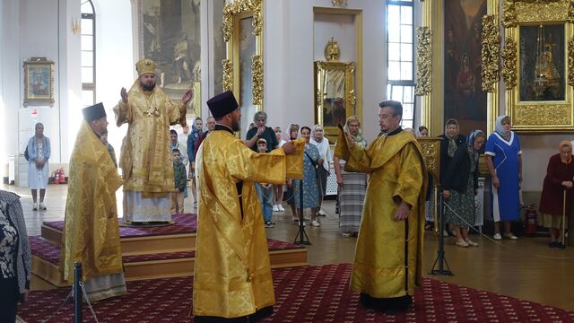 Его Преосвященству сослужили старший священник собора иерей Сергий Соловьев, протодиакон Михаил Бойков и клирик храма в честь святого благоверного князя Георгия Всеволодовича и святителя Симона диакон Димитрий Юсов.