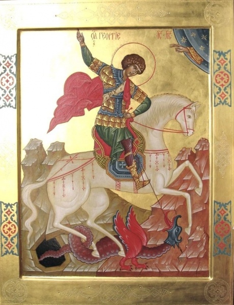 На иконах св. Георгий изображается сидящим на белом коне и поражающим копьем змея. Это изображение основано на предании и относится к посмертным чудесам святого великомученика Георгия. Рассказывают, что недалеко от места, где родился св. Георгий в городе Бейруте, в озере жил змей, который часто поедал людей той местности.