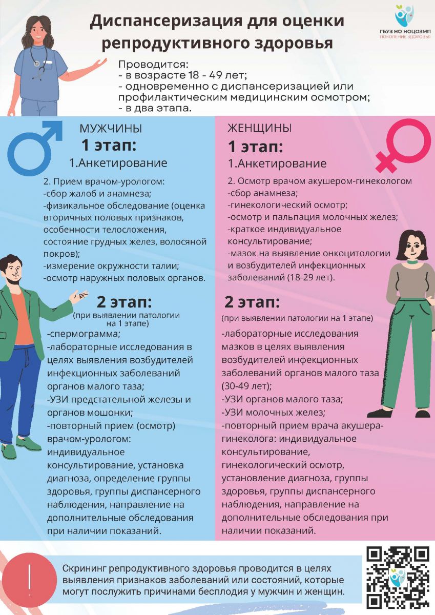 С 2024 года в перечень исследований в рамках диспансеризации входит оценка репродуктивного здоровья для мужчин и женщин от 18 до 49 лет. Оценка проводится одновременно с прохождением профилактических медицинских осмотров и диспансеризации.