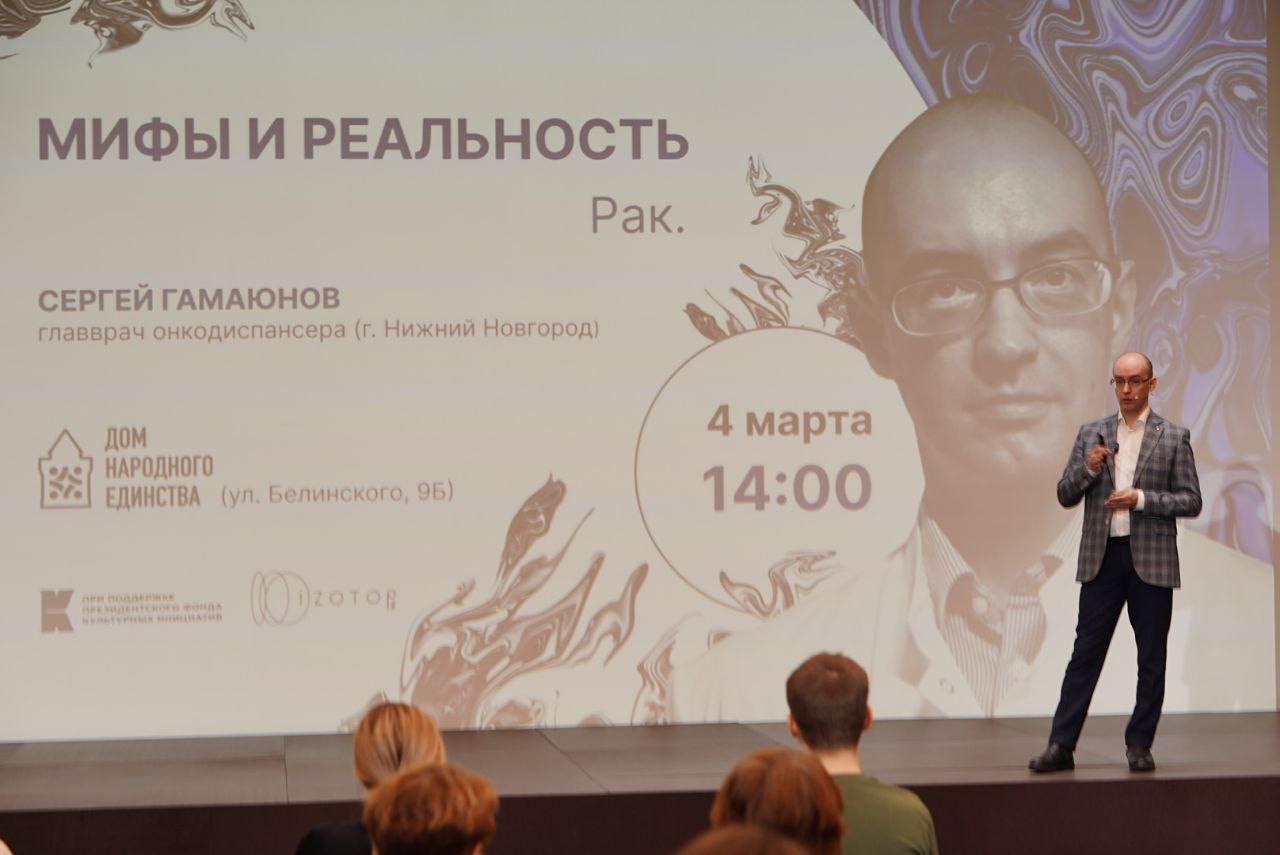 Серию лекций открыл Сергей Гамаюнов, главный врач «Нижегородского областного клинического онкологического диспансера» с ответами на самые распространенные вопросы аудитории: