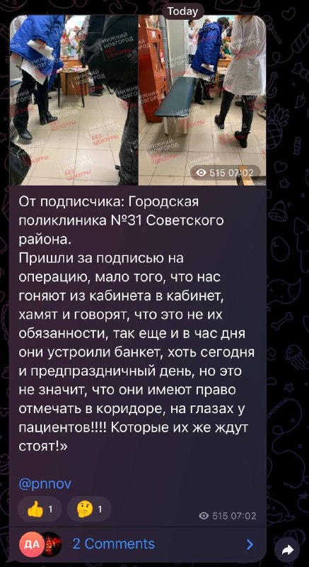Кем-то принесенную бутылку шампанского вы не открыли. На работе нельзя. Но видеокамера на телефоне успела запечатлеть эту короткую пересменку. Одни бегут на участок, другие пришли во вторую смену. Третьи — подняли свои непразднично загруженные головы от потока диагнозов. Как раз вчера Нижегородский женсовет и просил защиты от таких несанкционированных съемок и огульных обвинений, — написал министр.Он также уточнил, что знает, в каких условиях трудится коллектив больницы № 31. В условиях работы на первом этаже жилого дома делать это непросто, а все помещения максимально адаптированы под пребывание пациентов. Также Мелик-Гусейнов выразил мнение, что подобные жалобы и съемки — это внутренняя культура каждого человека, поэтому регулировать это нельзя.