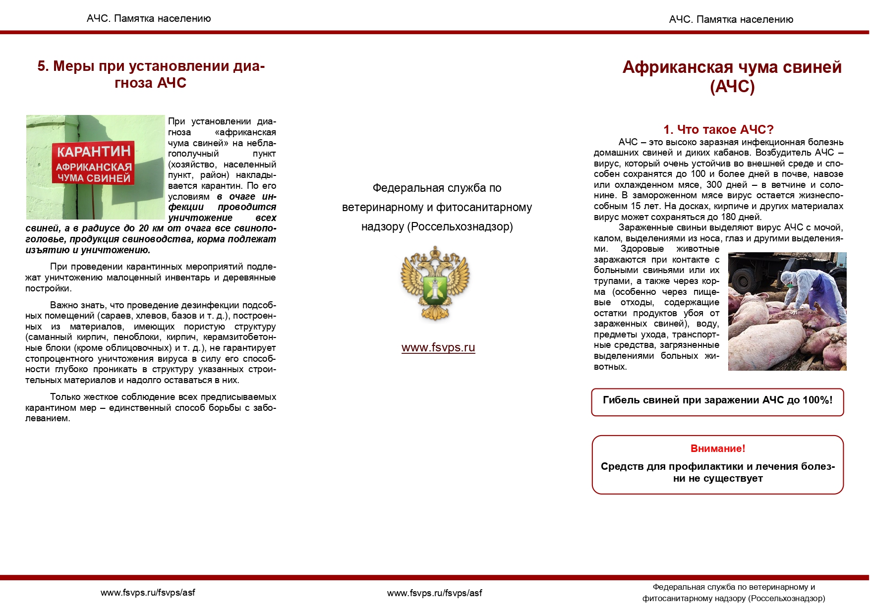 АЧС – это высоко заразная инфекционная болезнь домашних свиней и диких кабанов. Возбудителем АЧС является вирус, крайне устойчивый к физическому и химическому воздействию, сохраняется в продуктах свиного происхождения, не подвергнутых термической обработке (солёные и сырокопчёные пищевые изделия, пищевые отходы, идущие на корм свиньям). Болеют АЧС домашние и дикие свиньи независимо от возраста и породы. Погибает до 100 % заболевших свиней.